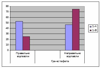 Отже, із таблиць та діаграм видно, що більші зрушення у правильності відповідей учнів в усних обчисленнях протягом навчального року відбулися в 1 А класі. Ми пояснюємо це тим, що учні 1 А класу навчалися за нашою експериментальною системою (порівняно з 1 В класом, де навчання проходило у звичайній формі).
