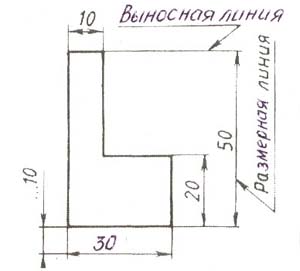 Виносні лінії. При нанесенні розмірів для вказівки границь виміру, і виносу розміру за контур зображення, проводять прямі. Лінії, що називають виносними. Їх варто проводити перпендикулярно прямолінійному відрізку елемента деталі, розмір якого вказують. Лінії, в основному, розташовують поза контуром зображення виду (проекції) предмета.