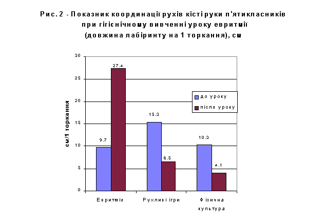 Дослідження рухово-координаційних реакцій м’язів кісті руки за результатами методики "Лабіринт" показали, що під впливом уроку евритмії об’єм роботи, тобто кількісний показник залишився на тому ж рівні, що і до уроку, однак значно збільшився якісний показник – координація рухів, що наглядно представлено на рисунку 2. (дод. В)
