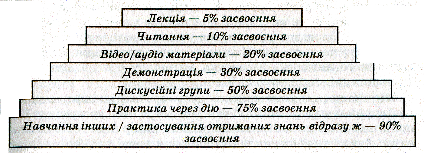 З піраміди видно, що найменших результатів можна досягти за умов пасивного навчання (лекція — 5%, читання — 10%), а найбільших — інтерактивного (дискусійні групи — 50%, практика через дію — 75%, навчання інших чи негайне застосування — 90%). Це, звичайно, середньостатистичні дані, і в конкретних випадках результати можуть бути дещо іншими, але в середньому таку закономірність може простежити кожен педагог.