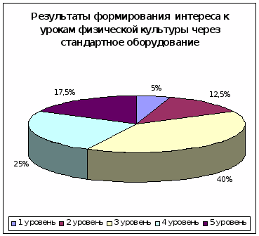 Из данных показателей мы видим, что самый большой процент ответов у уроков со стандартным оборудованием на 3 уровне, т.е. обычные уроки. После проведения уроков с нестандартным оборудованием мы видим, что показатели значительно изменились. К концу практики показатель перешел с 3 уровня на 4, где видно, что у детей формируется интерес к урокам физической культуры.
