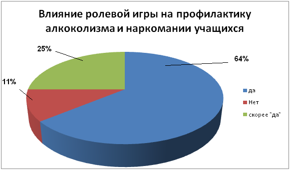 Из данных диаграммы, видим, что 64% учащихся считают, что ролевая игра будет влиять на профилактику алкоголизма и наркомании среди подростков, 25% отвечают, что скорее да – чем нет. И только 11% опрошенных ответили – нет.