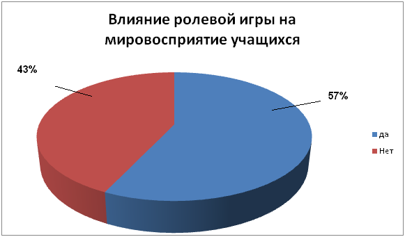 Из данных диаграммы 3, видим, что мнение учащихся о том, способны ли ролевые игры влиять на мировосприятие учащихся разделилось; наибольшая часть респондентов считают, что могут, это подтверждается тем, что на данный вопрос 57% респондентов ответили положительно; а отрицательно 43% респондентов.