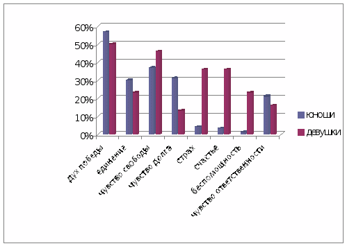 Из данных таблицы 12 и диаграммы 1, мы видим, что в ответе «свой вариант» респонденты указали такие эмоциональные состояния, как счастье (5,71%), и столько же респондентов отметили, что испытывали все указанные состояния. Наибольшее количество опрошенных указали, что наиболее сильным эмоциональным состоянием, которое они испытывали на ролевых играх, является дух победы (55%), «чувство свободы» (40%) и «единение» (28%). Для девушек также популярными ответами были: «страх» (36,67%) и «чувство смертельной опасности» (36,67%). А молодые люди чаще отмечали чувство долга (31,42%), единение (30%), чувство ответственности (21,43%). На основании ответов на данный вопрос, можно сказать, что ролевые игры способны развить чувство долга и ответственности, так как 46% ответивших отметили, что эти состояния тоже являются наиболее часто испытываемыми на ролевых играх.
