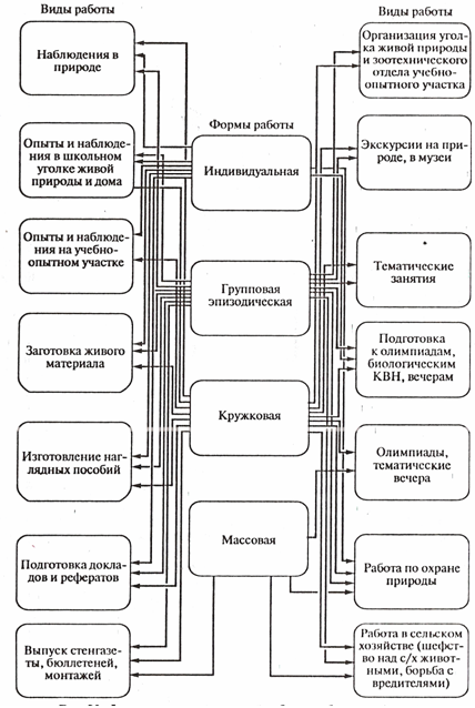 Основной формой внеклассной работы общепризнан кружок юных натуралистов. В выделении других форм наблюдаются расхождения. Наряду с кружком к формам внеклассной работы относят, например, внеклассное чтение. Наиболее приемлемое выделение форм предложено Н. М. Верзилиным. В книге «Общая методика преподавания биологии» (М., Просвещение, 1974) автор относит к формам внеклассной работы занятия индивидуальные, групповые и массовые. При этом кружок юных натуралистов в предложенной системе представлен как вид групповой формы внеклассных занятий.