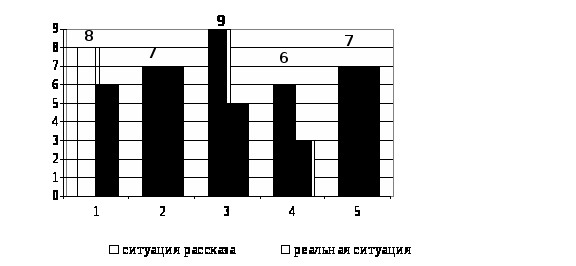 Представим соотношение результатов 1-ого и 2-ого этапов исследования в виде диаграммы, где цифрами 1-5 обозначены заданные в исследовании нравственные поступки (рис.1).