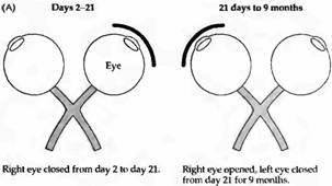 Когда веки одного глаза были сшиты вместе на протяжении первых двух недель жизни, обезьяны и котята продолжали развиваться нормально и использовали неоперированный глаз. Через 1—3 месяца, однако, когда открывался оперированный глаз, а нормальный закрывался, становилось очевидным, что животные были практически полностью слепы на оперируемый глаз. При этом котята ударялись о находящиеся вокруг предметы и падали со стола, но не было обнаружено какого-либо значительного физиологического дефекта в оперированных глазах, зрачковый рефлекс оставался нормальным, как и электроретинограмма, которая представляет собой карту суммарной электрической активности глаза. Сигналы от ганглионарных клеток сетчатки у депривированных животных ничем не отличались от нормальных, как и их рецептивные поля.