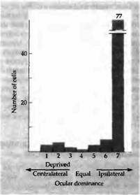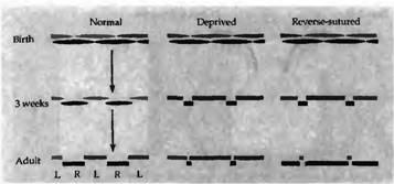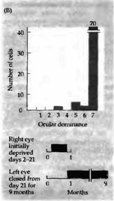В какой степени возможно восстановление после депривации во время критического периода? Даже если депривированный глаз после критического периода остается открытым на протяжении месяцев и лет, повреждение является перманентным, происходит лишь небольшое восстановление в редких случаях. Животное на всю жизнь остается слепым на один глаз, что сопровождается уменьшением колонок и асимметрией в гистограмме глазного доминирования. На животных с монокулярной депривацией проводились эксперименты, когда открывался ранее депривированный глаз и закрывался глаз, который раньше был нормальным. Эта процедура, называемая «обратное зашивание», приводила к значительному восстановлению зрения, но только в том случае, если она проводилась на протяжении критического периода. Детеныши обезьян и котята не только начинали снова видеть на изначально депривированный глаз, но они также становились слепыми на другой глаз. Соответственно этим изменениям происходил сдвиг гистограммы глазного доминирования таким образом, что глаз, открытый после депривации, управлял большим количеством клеток, чем глаз, который был открыт на протяжении первых недель и затем закрыт. Более того, анатомическое строение слоя 4, выявленное при помоши авторадиографии, также претерпевало соответствующие изменения: уменьшенные регионы, управляемые первоначально закрытым глазом, расширялись за счет регионов противоположного глаза. На рис. 5 показана гистограмма глазного доминирования и авторадиограмма коры обезьяны, у которой правый глаз был закрыт в возрасте 2 дней на протяжении трех недель. По прошествии этого времени депривированный глаз уже не мог управлять корковыми клетками и колонки, которые им управлялись, уменьшились. После этого правый глаз был открыт, а левый закрыт на протяжении следующих 9 месяцев. В конце этого периода все нейроны управлялись только первоначально депривированным правым глазом и зоны коры, контролируемые им, расширились.