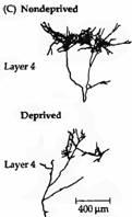 Морфологические последствия закрытия одного глаза наиболее хорошо были заметны в слое 4 первичной зрительной коры, где волокна из ЛКТ прерываются, образуя строго определенный паттерн ветвления. Изменения в колонках глазного доминирования, возникающие вследствие закрытия век у обезьян, были выявлены при помощи авторадиографии коры после введения радиоактивных веществ в один глаз. После длительного закрытия век наблюдалось значительное уменьшение ширины колонок глазного доминирования, связанных с закрытым глазом. В то же самое время колонки, управляемые нормальным глазом, соответственно увеличивались в ширине по сравнению с тем, какими они должны быть у взрослых обезьян в норме. Уменьшение колонок глазного доминирования наглядно видно на рис. 3, где нормальные колонки можно сравнить с колонками животных, глаз которых был закрыт в возрасте 2 недель и оставался закрытым на протяжении 18 месяцев. Эти изменения говорят о том, что аксоны из ЛКТ, управляемые нормальным глазом, захватывают и удерживают территорию коры, управляемую более слабым, зрительно депривированным соседним глазом. Эти данные подтверждаются физиологическими наблюдениями по регистрации электрической активности клеток слоя 4. Почти все клетки получали управление только от недепривированного глаза. Некоторые свойства коры менее чувствительны к депривации. Так, например, энуклеация (удаление) одного или даже обоих глаз не вызывало изменений в распределении «пятен» в области V>1> и полос при окраске на цитохромоксидазу в области V>2>.