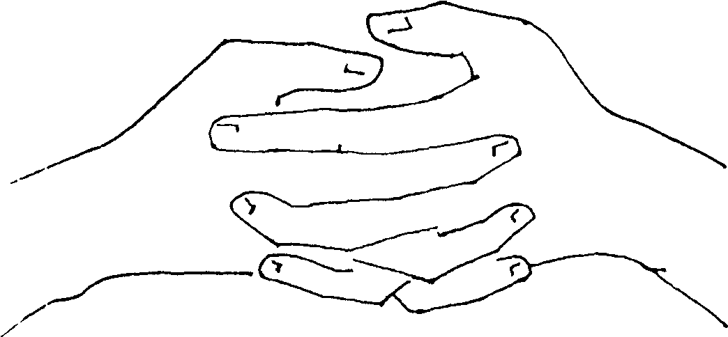 руки в вертикальном положении, прижать ладони обеих рук друг к другу, затем слегка раздвинуть их, округлив пальцы;