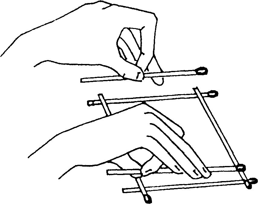 Играют двое. Первый берет две спички и укладывает их на столе параллельно друг другу на расстоянии, чуть меньшей длины спички. Второй берет еще две спички и осторожно укладывает их к первым перпендикулярно им так, чтобы получился квадрат.