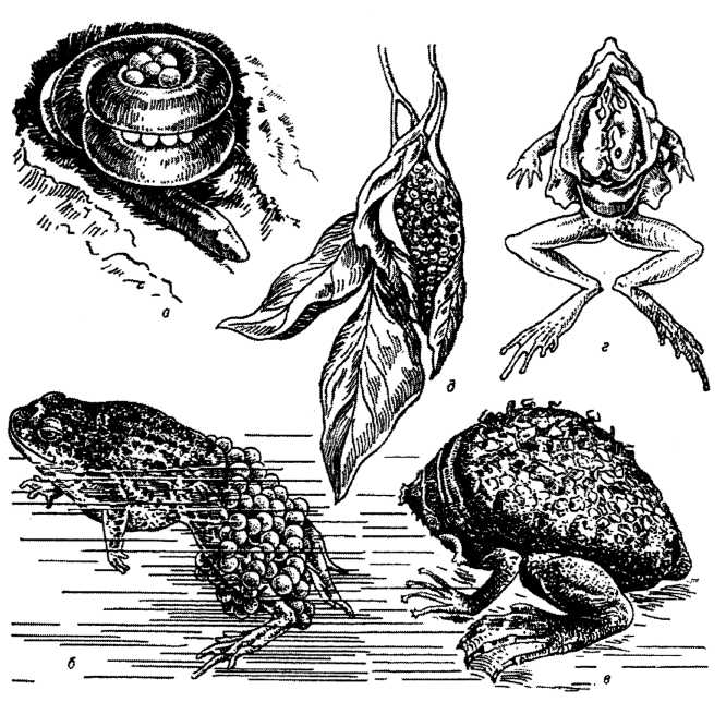 Рис. 1. Турбота про потомство в амфібій: а - самка рибозмія цейлонського, яка обвилась навколо яєць, відкладених у спеціально викопаній нірці; б — жаба-повитуха, що виношує яйця на задніх кінцівках; в - піпа сурінамська - виношує яйця у виводкових комірках на спині; г - жаба чілійська - метаморфоз пуголовків відбувається у голосовому мішку самця; д — гніздо квакші південноамериканської над водою.