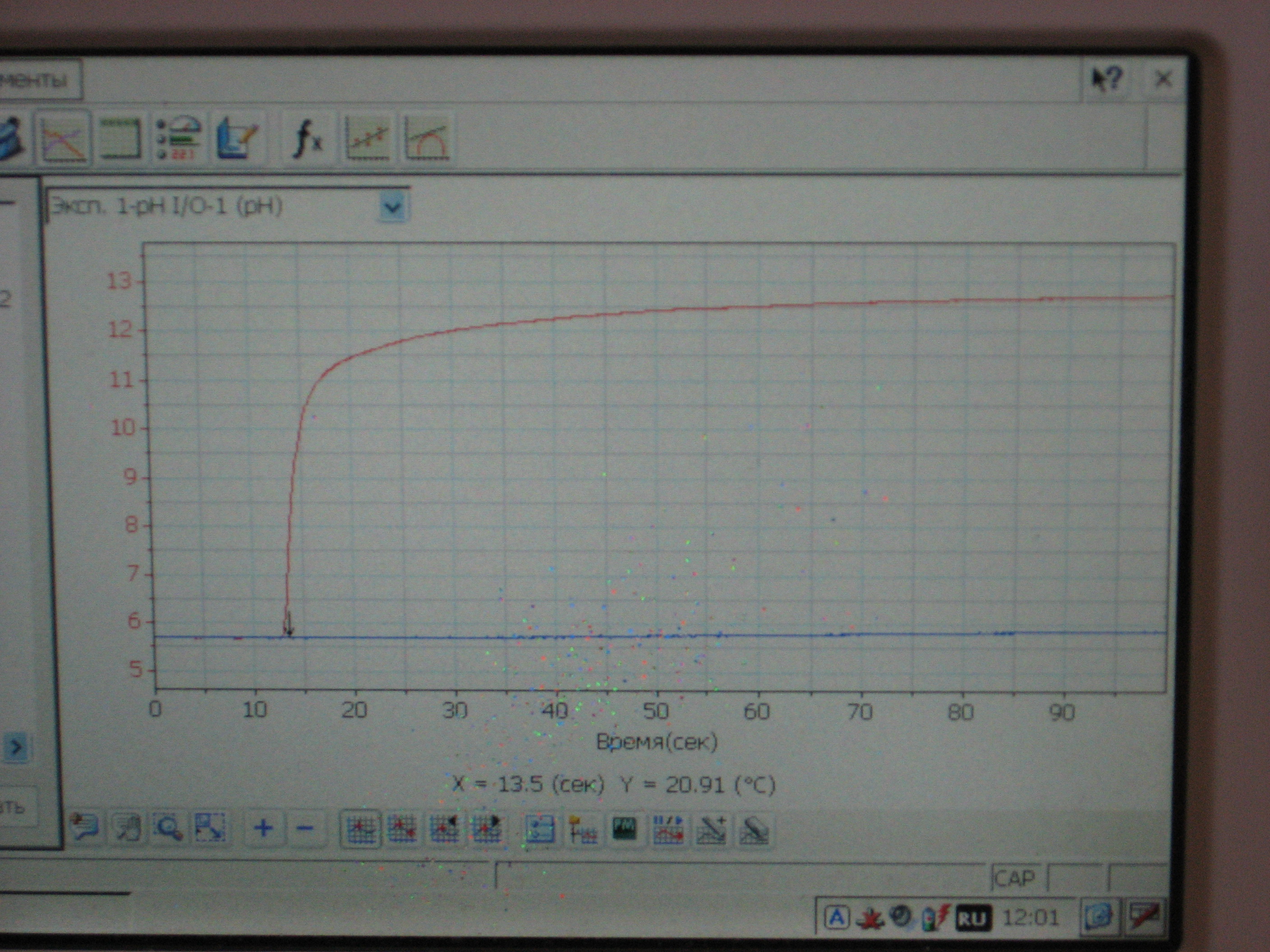Оборудование и реактивы: молоко пастеризованное и не пастеризованное, 0,1 М раствор гидроксида натрия, бюретка, воронка, колбы для титрованиия, фенолфталеин, цифровая лаборатория «Архимед», насадка – рН-метр, мешалка. А) Ход опыта: В колбу для титрования наливают 10 мл молока, 20 мл дистиллированной воды, 5 капель 2% раствора фенолфталеина. Смесь хорошо перемешивают. Затем по каплям прибавляют 0,1 М раствор едкого натра, фиксируя при этом цвет индикатора (появление розоватой окраски). Б) Настройка параметров измерения «Архимеда»: 1) частота измерений – каждую секунду; 2) число замеров – 1000 Ход опыта: В колбу для титрования наливают 10 мл молока, 20 мл дистиллированной воды, 5 капель 2% раствора фенолфталеина. Смесь хорошо перемешивают при помощи магнитной мешалки. Затем опускают датчик рН и начинают по каплям из бюретки прибавлять 0,1 М раствор едкого натра, при включённой мешалке, до рН 8,2 (по показаниям прибора), фиксируя при этом цвет индикатора (появление розоватой окраски). Полученные данные занести в таблицу №1 .Опыт повторяют 3 раза. Таблица №1 - Кислотность молока