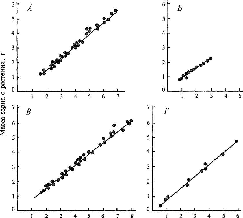 Рис. 83. Точечные диаграммы и графики регрессии массы зерна с растения на массу колосьев у сорта яровой пшеницы Сонора 64 при выращивании растений без орошения {вверху) и при двукратном поливе (внизу); размещение растений 15 х 5 см (А, В) и 15 х 1 см (Б, Г)