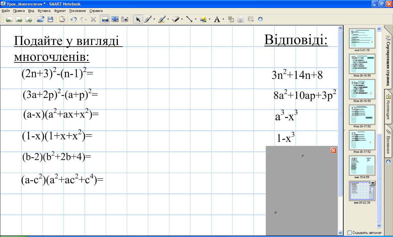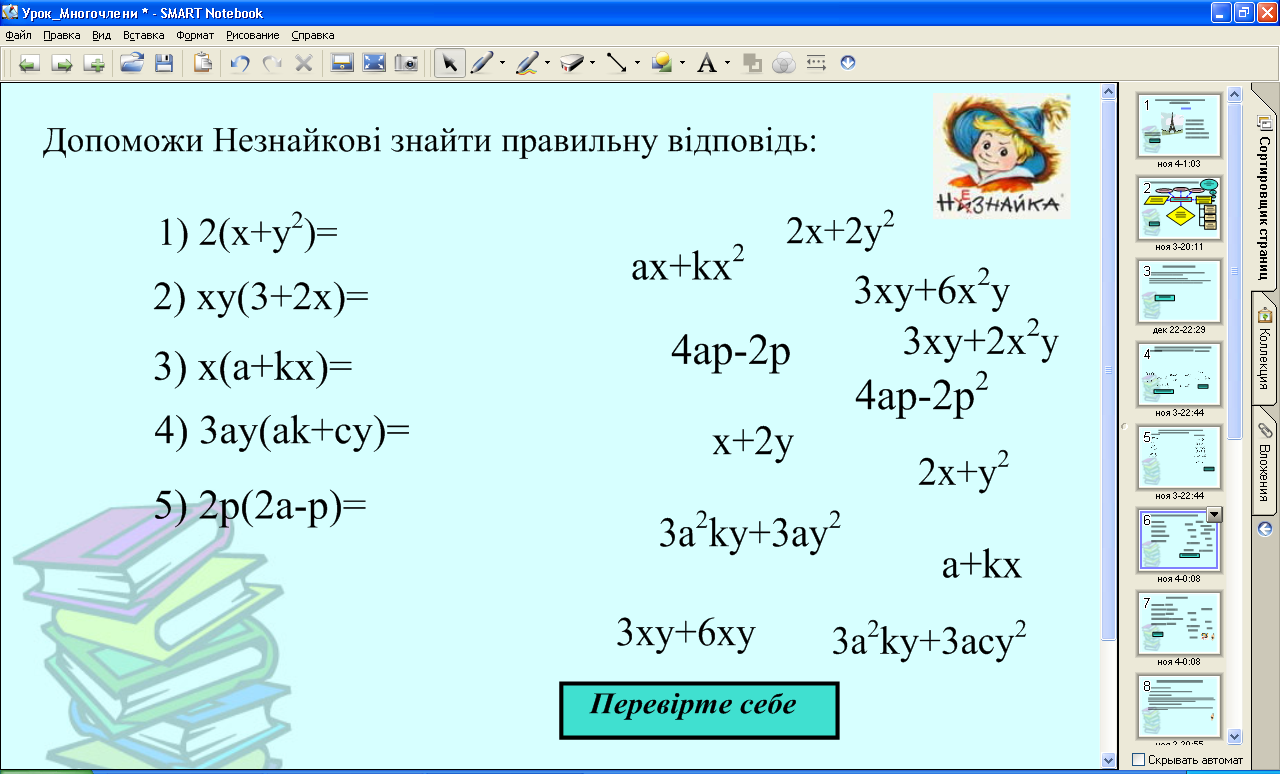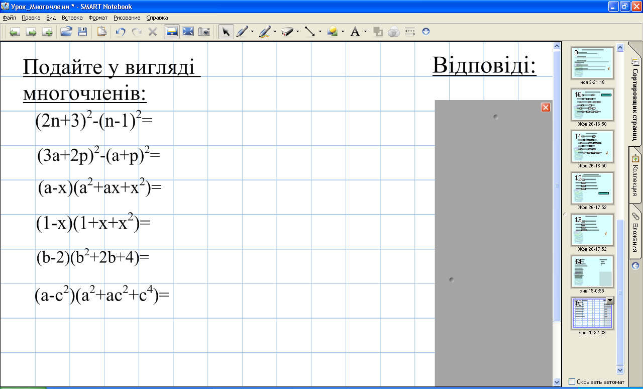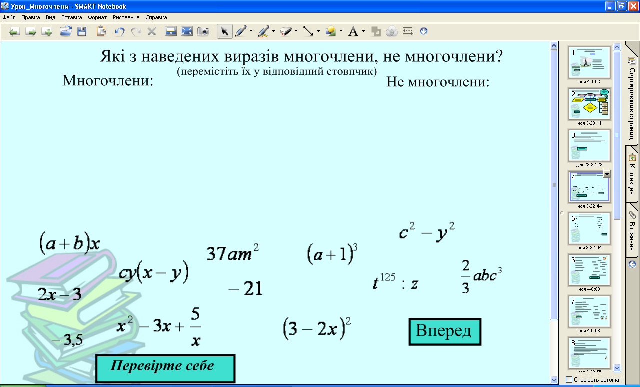 Нами розроблено декілька уроків та систем завдань з тем «Вивчення многочленів» та «Формул скороченого множення». За для цього спочатку ми відкрили програму Notebook і на вкладці «Колекція» вибрали фон, потім використовуючи спеціальний інструмент для введення тексту з клавіатури ввели текст завдання.
