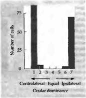 Сначала результаты подобных опытов разочаровывали: после нескольких месяцев зрение в обоих глазах оперированного животного оставалось нормальным, и Хьюбель и Визелъ уже были готовы прекратить эту напряженную серию экспериментов (личное сообщение). Тем не менее они смогли получить следующие данные о работе корковых клеток. Отдельные корковые клетки имели нормальные рецептивные поля и живо отвечали на определенным образом ориентированные стимулы. Однако почти каждая клетка отвечала только на стимуляцию одного глаза, некоторые управлялись правым, некоторые — левым, но практически ни одна — обоими глазами. Клетки, как обычно, были сгруппированы в колонки по отношению к глазному предпочтению и к ориентации оси зрительного поля. Как и ожидалось, возникала атрофия в области ЛКТ, хотя колончатая архитектура слоя 4 оставалась без изменений. Почти полное отсутствие бинокулярного представления в коре показано на гистограмме, полученной от обезьяны с искусственно вызванным косоглазием (рис. 2). Критический период для смещенного (из-за косоглазия) восприятия, в течение которого возникают данные изменения, близок к критическому периоду монокулярной депривации.
