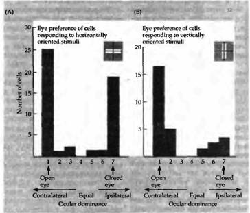 При проведении тестов для определения ориентационного предпочтения были получены результаты, показанные на рис. 2. И. Оба глаза одинаково отвечали на горизонтально ориентированные линии, однако на вертикальные гораздо эффективнее отвечал левый (открытый) глаз. Возможным объяснением этого факта может служить то, что ни один глаз не видел горизонтальные полоски или контуры на протяжении критического периода. Следовательно, стимуляция горизонтальными линиями является для них аналогом бинокулярной депривации, то есть конкуренция по отношению к ним была равной. Что касается вертикальных полосок, здесь открытый глаз получил гораздо больше опыта, по сравнению с закрытым, и «захватил» часть клеток в колонках вертикальной ориентации, которые первоначально принадлежали депривированному глазу. Подобные же результаты были получены Бонхоеффером с коллегами на котятах, которым представлялись только полоски определенной ориентации.