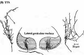 Рис. 4. Эффект подавления электрической активности тетродотоксином на ветвистость нервных волокон глазного нерва, заканчивающихся в ЛКТ. (А) У нормального котенка окончания зрительного нерва, помеченные при помощи пероксидазы хрена, ограничены пределом того слоя, где они в норме заканчиваются. (В) После применения тетродотоксина на протяжении 16 дней в эмбриональном возрасте, помеченные аксоны имеют гораздо большую ветвистость и не ограничены всего лишь одним слоем.