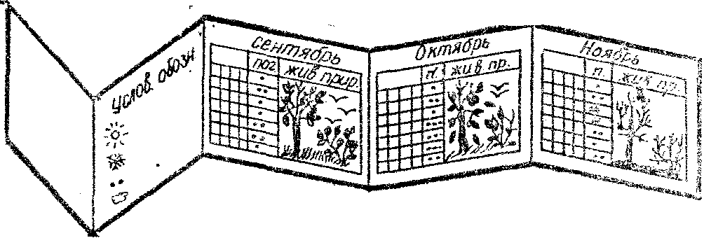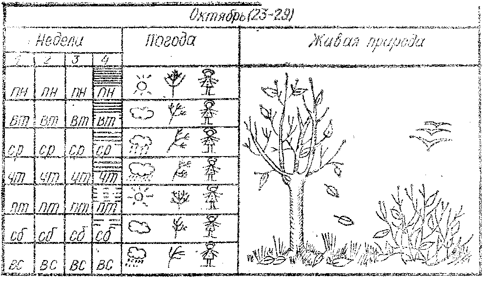 Календарь наблюдения за сезонными изменениями в природе. Такой календарь отражает состояние природы (неживой, растительного и животного мира) в ту неделю, когда происходят ежедневные наблюдения (рис.1.5). Заполнение страницы календаря, то есть фиксация наблюдений, неотъемлемая часть "недельной методики" ознакомления детей с сезонными явлениями природы.