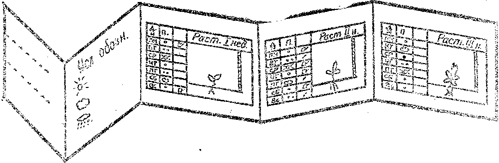 Еще один способ заполнения – это календарь-ширма. Он отражает пространственно временные параметры роста и развития огородной культуры (рис.1.2). Одноразовые еженедельные наблюдения и отметки (цветной рисунок) создают картину последовательных изменении подземной и надземной частей растения. Одновременная запись погоды, трудовых операций дает представление (хотя и неполное) об условиях, в которых развивается овощная культура. Графа «время», например, показывает, сколько недель длится развитие корнеплода. Аналогичным образом можно моделировать процесс роста и развития любого растения (грунтового или комнатного), выращиваемого вегетативным способом или из семян, но имеющего относительно быстрый рост и непродолжительный период развития.