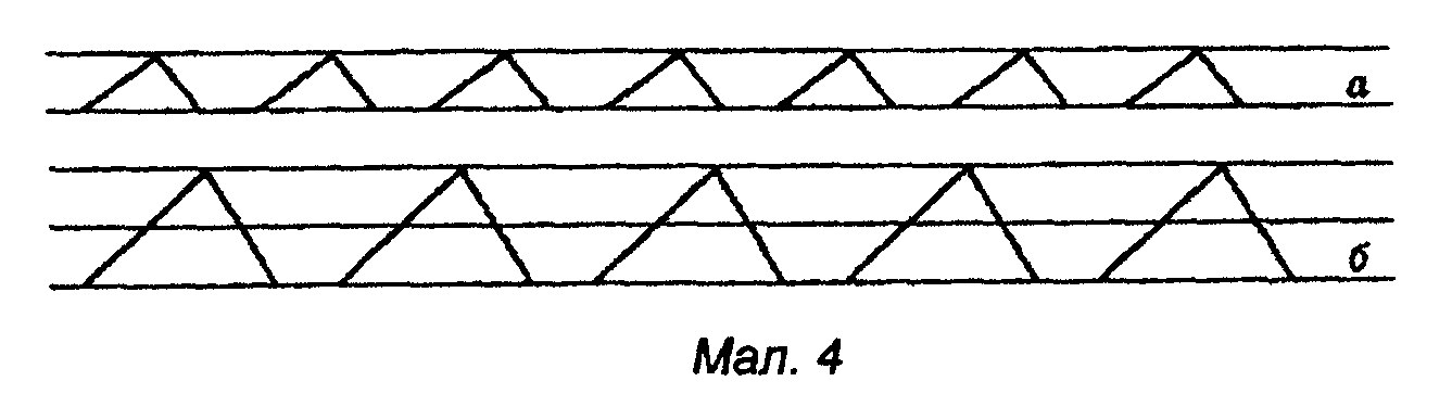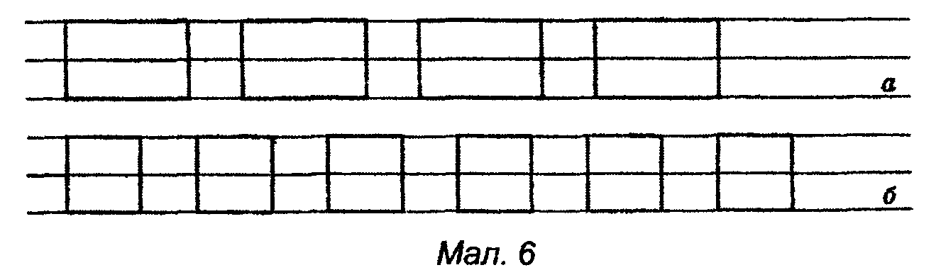 Матеріал: зошити, кольорові олівці, зразок (мал.4). Перший рядок виконують між першою і другою лінійками, не виходячи за межі рядка. Починати лінію потрібно знизу й проводити вгору, а потім згори вниз. Трохи відступити й знову починати проводите лінію знизу вгору. Перший рядок діти виконують червоним олівцем (варіант, а). Другий рядок пропускають, а потім проводять ламані лінії між третьою і п'ятою лінійками синім олівцем (варіант, б).