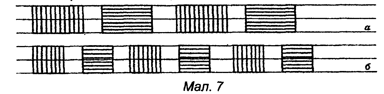 Мета: учити дітей штрихувати в певних межах, проводити вертикальні й горизонтальні лінії в один бік, не відриваючи олівця й не виходячи за межі контуру; розвивати вміння орієнтуватись у напрямах: згори вниз, зліва направо, вправляти дрібні м'язи пальців, п'ясті руки, окомір. Матеріал: прості олівці, зошити, зразок (мал. 7). На першому прямокутнику прямі лінії йдуть рівно згори вниз, розташовані вони близько одна до одної. На другому прямокутнику прямі лінії потрібно проводити теж рівно, але зліва направо, близько одна до одної.