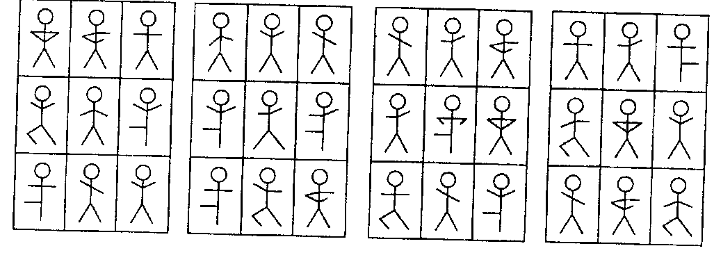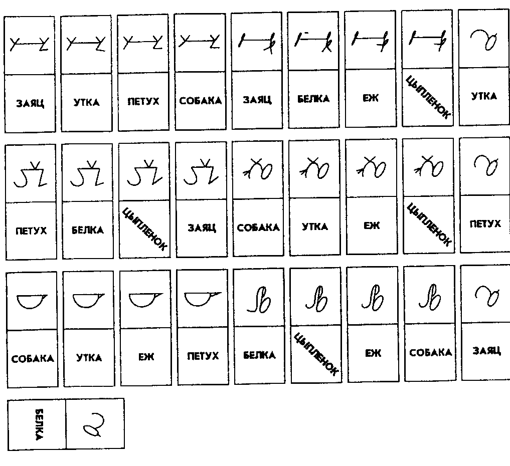 Материал: Три набора карточек (по девять карточек в каждом наборе). На карточках изображены геометрические фигуры (по одной на каждой карточке): треугольник, квадрат, круг. Каждая фигура изображена на фоне трех степеней насыщенности: бледно-розовом, розовом, красном. В первом наборе все фигуры черного цвета. Во втором — белого, в третьем — серого. На оборотной стороне карточек записаны бессмысленные сочетания из трех букв (для первого набора — пак, для второго — бро, для третьего — вил). Учитель делит карточки на группы и предлагает детям угадать задуманную комбинацию фигур. Признаки, объединяющие фигуры в группу, ученик должен выявить, иногда пользуясь бессмысленными словами, записанными на оборотной стороне карточек: фигуры, принадлежащие к одной и той же группе, на обороте имеют одинаковые надписи. Очень важно подвести детей к тому, чтобы они как можно реже заглядывали на оборотную сторону карточки. Таким образом, перед детьми стоит задача — образовать искусственные понятия, пользуясь двумя рядами стимулов: один ряд выполняет функцию объекта, на который направлена деятельность учащихся, другой ряд — функцию знаков, организующих их деятельность.
