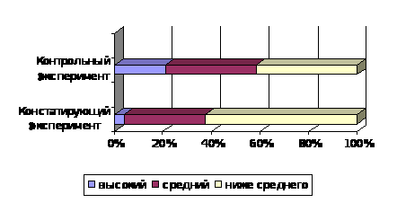 Высокий уровень был зарегистрирован у 20,8 % детей, средний – 37,5 % детей, уровень ниже среднего показал 41,7 % детей. Результаты констатирующего и контрольного экспериментов по определению уровней овладения детьми дошкольного возраста деятельностью экспериментирования представлены на рисунке 3.