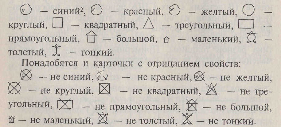 Наряду с логическими блоками в работе применяются карточки (5x5 см), на которых условно обозначены свойства блоков (цвет, форма, размер, толщина).