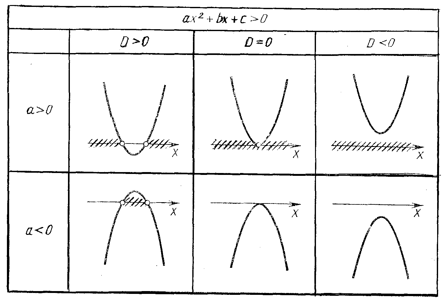 Использование координатной плоскости позволяет применить графические методы к решению и исследованию неравенств и их систем как с одним, так и с двумя неизвестными. Графические приемы эффективно применяются для изображения результатов исследования там, где чисто аналитическая запись громоздка. Характерным примером служит схема, на которой приведены различные случаи решения неравенства ax²+bx+c>0, помещенная на рис.3. В результате определенной тренировки учащиеся привыкают пользоваться такой схемой, а затем ее мысленным образом.