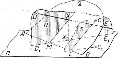 В пересечении прямых LМ и DE, лежащих в одной плоскости R, находим искомую точку X, которая на чертеже определяется своим изображением и изображением своей проекции Х1 на плоскость П.