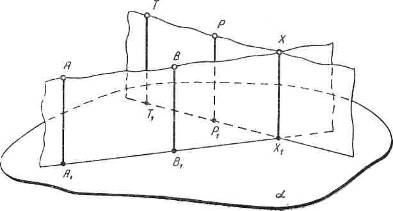 Пусть проектирующие плоскости заданы проектирующими прямыми АА1 и ВВ1 ТТ1 и РР1. Одной точкой линии пересечения заданных плоскостей будет точка Х1 —точка пересечения следов обеих плоскостей. В оригинале линия пересечения проектирующих плоскостей будет проектирующей прямой, как линия пересечения двух плоскостей, проведенных через параллельные (проектирующие) прямые. Следовательно, и на изображении прямая ХХ1, по которой пересекаются проектирующие плоскости, будет параллельна АА1.