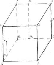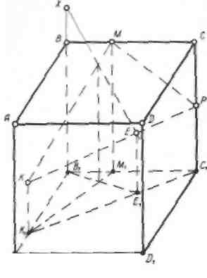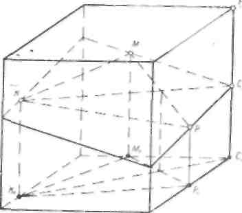 При построении сечения куба (рис. 10а) плоскостью КМР (К1М1Р1) не следует препятствовать применению общего метода (рис. 10б). Однако решение этой задачи следует вести до тех пор, пока учащиеся не догадаются, что наиболее подходящей вспомогательной плоскостью будет плоскость грани BB1 CC, (рис. 10в), а не плоскости ВВ1ЕЕ1.