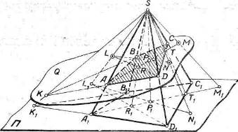 Задача 2. Найти линию пересечения четырёхугольной пирамиды SA1B1C1D1 с плоскостью Q, проходящей через точки L(L1), М (М1) и N(N1) (рис.15).