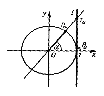 Тангенс же во всех учебниках, за исключением [11], определяется как отношение синуса к косинусу. В учебнике же [11] опять не дается четкого определения тангенса, а приводится лишь геометрическая интерпретация «ордината точки пересечения прямой ОР>> (Р>>> >- точка на единичной окружности) и касательной к окружности в точке (1;0) равна тангенсу угла ».