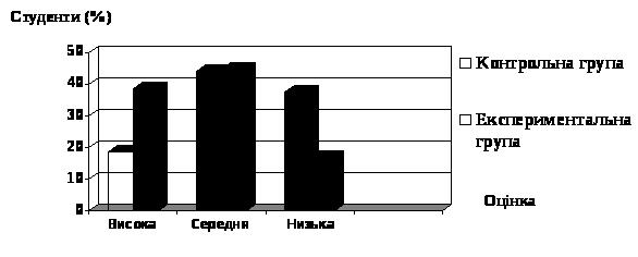 Рис.1 Розподіл оцінок сформованості економічних знань засобами комп’ютерних технологій у студентів контрольної та експериментальної груп