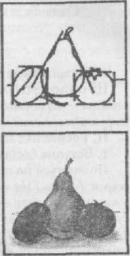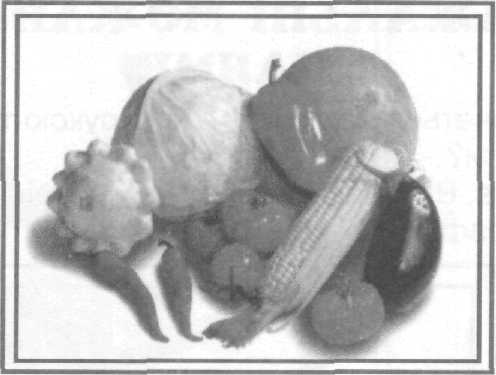 Сьогодні ми теж малюватимемо натюрморт, але, звичайно, не такий складний як у знаних художників. У нас є різні овочі і фрукти. Давайте складемо з них натюрморт, взявши декілька предметів, як показано на таблиці.