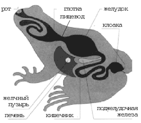 Внутреннее строение лягушки Пищеварительная система земноводных имеет почти такое же строение, как у рыб. В отличие от рыб задняя кишка открывается не прямо наружу, а в особое ее расширение, называемое клоакой. В клоаку открываются также мочеточники и выводные протоки органов размножения.