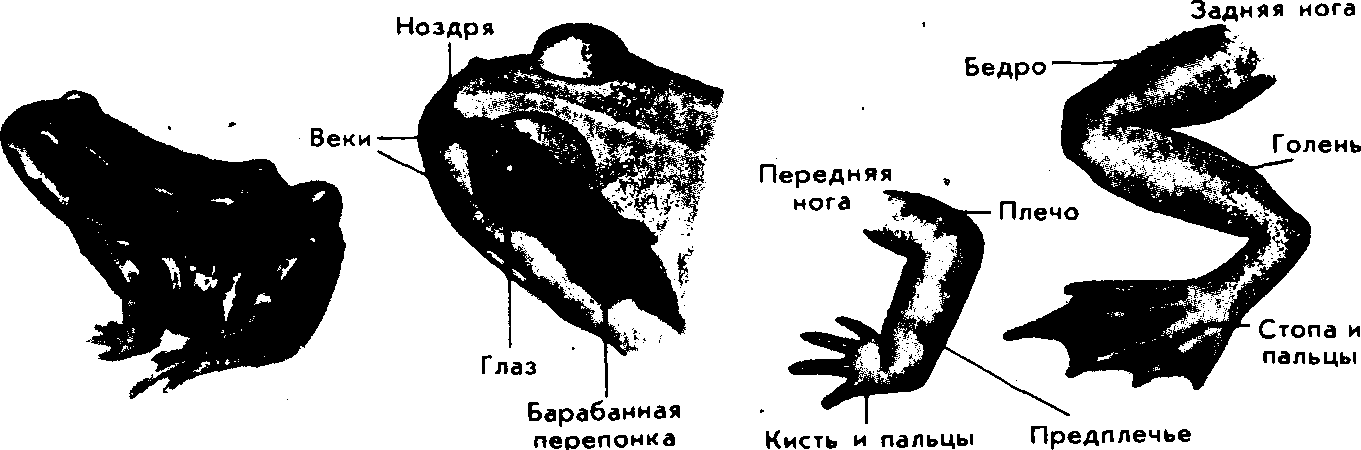 У лягушки хорошо развиты парные конечности — передние и задние ноги. И те и другие состоят из трех главных отделов, но называются они по-разному. В передней ноге различают плечо, предплечье и кисть. У лягушки кисть заканчивается четырьмя пальцами (пятый палец у нее недоразвит). В задней конечности эти отделы называют бедром, голенью и стопой. Стопа заканчивается пятью пальцами, которые у лягушки соединены плавательной перепонкой. Отделы конечностей подвижно сочленены между собой при помощи суставов. Задние ноги значительно длиннее и сильнее передних, они играют главную роль при движении. Сидящая лягушка опирается на слегка согнутые передние конечности, задние при этом сложены и находятся по бокам тела. Быстро распрямляя их, лягушка совершает прыжок. Передние ноги при этом предохраняют животное от удара о землю. Плавает лягушка, подтягивая и выпрямляя задние конечности, а передние при этом прижимает к телу.