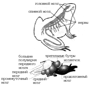 Центральная нервная система земноводных состоит из тех же отделов, что и у рыб. Передний мозг развит сильнее, чем у.рыб, и в нем можно различить два вздутия — большие полушария. Тело земноводных прижато к земле, и им не приходится поддерживать равновесие. В связи с этим мозжечок, управляющий координацией движений, развит у них слабее, чем у рыб.