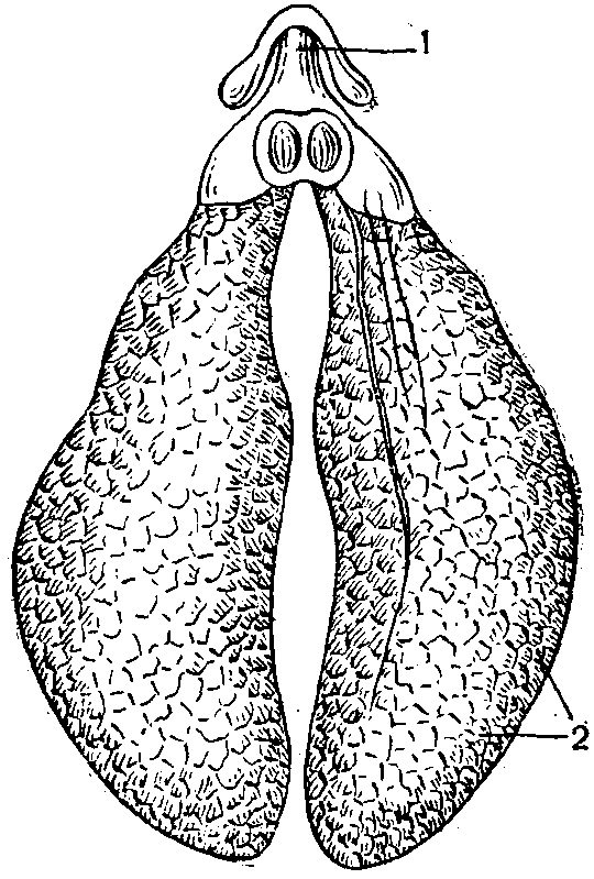 Пищеварительная система лягушки: 1 — пищевод; г —желудок; 3 — тонкий отдел кишечника, 4 — прямая кишка; 5 — мочевой пузырь; 6 — клоака.