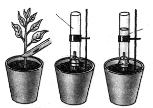 После такого краткого вступления демонстрируется опыт, показывающий поглощение воды корнями. Для опыта используется V-образный стеклянный прибор (потометр), который заполняется подкрашенной водой. В широкое колено прибора помещается бальзамин с хорошо развитыми корнями. Прибор укрепляется в штативе. В потометре с растением через несколько часов происходит понижение уровня воды.