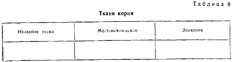 С целью закрепления знаний о внутреннем -строении корня, его тканях можно организовать самостоятельную работу учащихся с учебником по заданию: найдите в тексте материал о тканях, выпишите определение ткани; заполните таблицу 8.