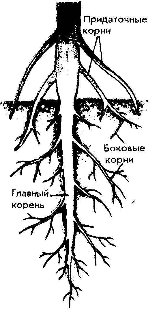 Корни, образующиеся на стеблях, а у некоторых растений и на листьях, называют придаточными. От главного и придаточных корней отходят боковые корни.