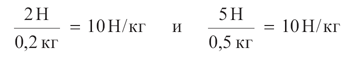На рисунке 1 изображен опыт с двумя гирями и динамометрами. Вы видите, что при массе гири 200 г (то есть 0,2 кг) на неё действует сила тяжести 2 Н, а при массе 500 г (то есть 0,5 кг) – сила тяжести 5 Н. Обратим внимание на закономерность: