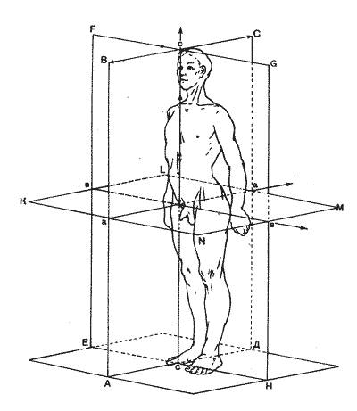 Различают три оси тела: вертикальную, поперечную и сагиттальную. Все они пересекаются друг с другом под прямыми углами. Вертикальная ось самая длинная и перпендикулярна к плоскости опоры. Поперечная ось идет параллельно плоскости опоры. Сагиттальная ось, получившая название от латинского слова «сагитта» — стрела, направлена спереди назад. Поперечных и сагиттальных осей можно провести любое количество, вертикальную же ось — только одну. Поэтому вертикальная ось называется основной осью. Осям соответствуют три плоскости — сагиттальная, фронтальная и горизонтальная.