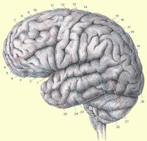 1. Латеральная борозда, sulcus lateralis (сильвиева борозда). 2. Покрышечная часть, pars opercularis, лобная покрышка, operculum frontale. 3. Треугольная часть, pars triangularis. 4. Глазничная часть, pars orbitalis. 5. Нижняя лобная извилина, gyrus frontalis inferior. 6.Нижняя лобная борозда, suicus frontalis inferior. 7. Верхняя лобная борозда, suicus frontalis superior. 8. Средняя лобная извилина, gyrus frontalis medius. 9. Верхняя лобная извилина, gyrus frontalis superior. 10. Нижняя предцентральная борозда, sulcus precentralis inferior. 11. Предцентральная извилина, gyrus precentralis (anterior). 12. Верхняя предцентральная борозда, sulcus precentralis superior. 13.Центральная борозда, sulcus centralis (роландова борозда). 14.Постцентральная извилина, gyrus postcentralis (gyrus centralis posterior). 15. Внутритеменная борозда, sulcus intraparietalis. 16.Верхняя теменная долька, lobulus parietalis superior. 17. Нижняя теменная долька, lobulus parietalis inferior. 18. Надкраевая извилина, gyrus supramarginalis. 19. Угловая извилина, gyrus angularis. 20. Затылочный полюс, polus occipitalis. 21. Нижняя височная борозда, suicus temporalis inferior. 22. Верхняя височная извилина, gyrus temporalis superior. 23. Средняя височная извилина, gyrus temporalis medius. 24. Нижняя височная извилина, gyrus temporalis inferior. 25. Верхняя височная борозда, suicus temporalis superior.