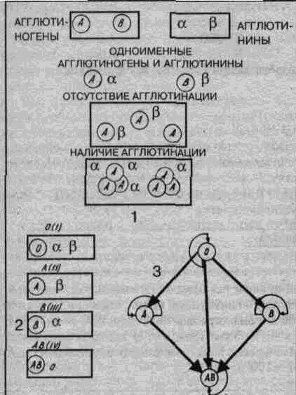 При наличии одноименных агглютиногенов и агглютининов (А и α, В и β) происходит реакция агглютинации (склеивания).