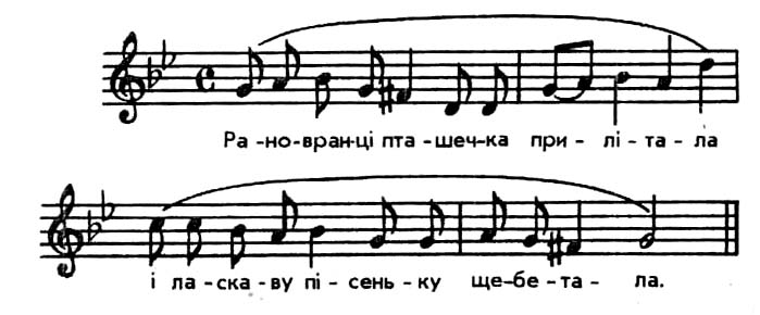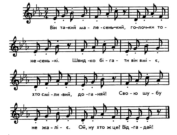 – Діти, ви, звичайно, не раз слухали музику, особливо в дитячому садку. Співали про маму, природу, пташок і про різних тварин. Кожна пісенька по-своєму красива. Зараз я проспіваю вам ще одну. Ви уважно її послухайте і скажіть, чи вона вам знайома і про кого в ній ідеться.