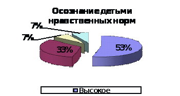 В результате мы увидели, что после проведенных занятий по нравственному воспитанию почти половина испытуемых показала высокое осознание нравственных норм и лишь маленький процент испытуемых (7 %) показали низкий и очень низкий уровень осознания нравственных норм. Хотя до проведения специальных занятий по нравственному воспитанию детей у них эти показатели были совсем другими: около 30 % детей показывало низкий и очень низкий уровень осознания нравственных норм.